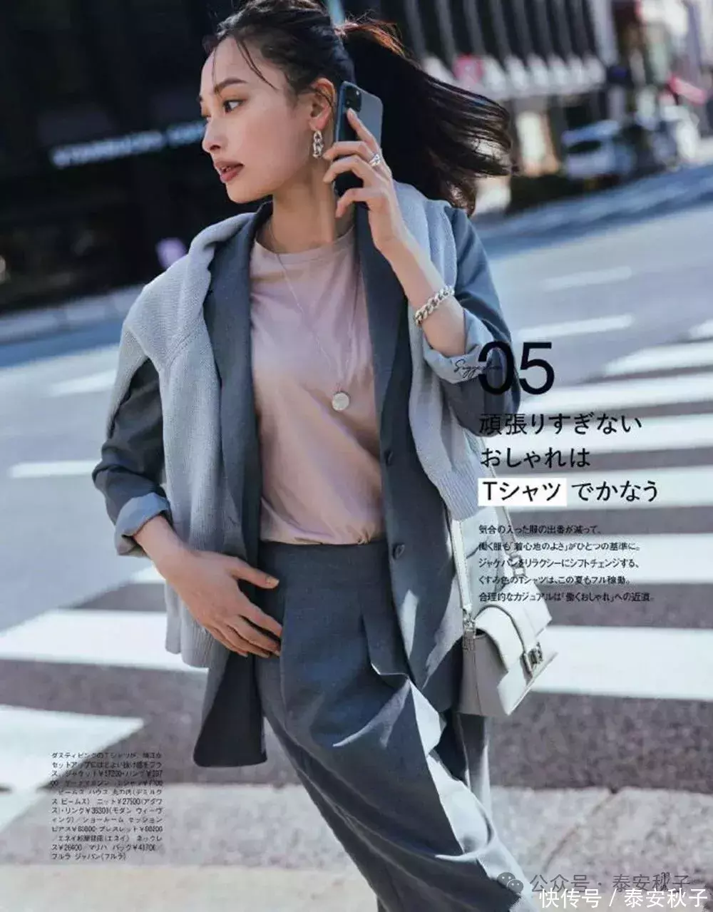 为了避开这种情况,我们可以选择撞色的内搭来搭配:比如在深灰色西装的里面叠穿裸粉色的小衫,灰+粉的结合,会让你变得更时尚,更有女人味了。牛仔阔腿裤配西装,洒脱又帅气